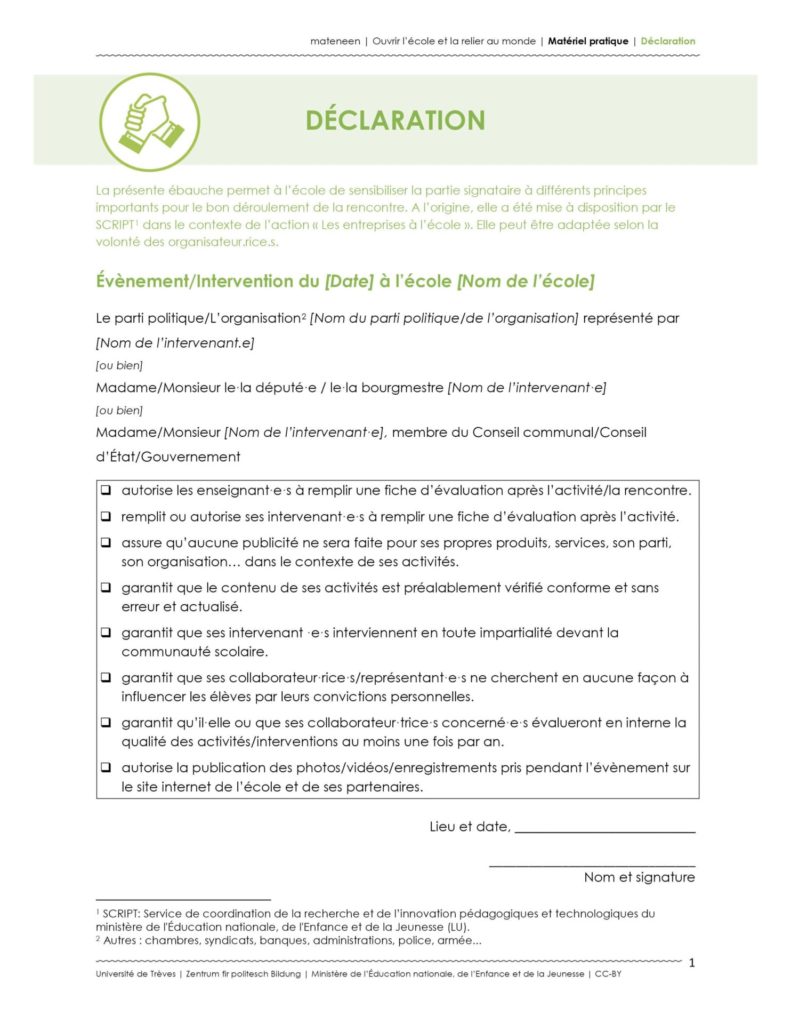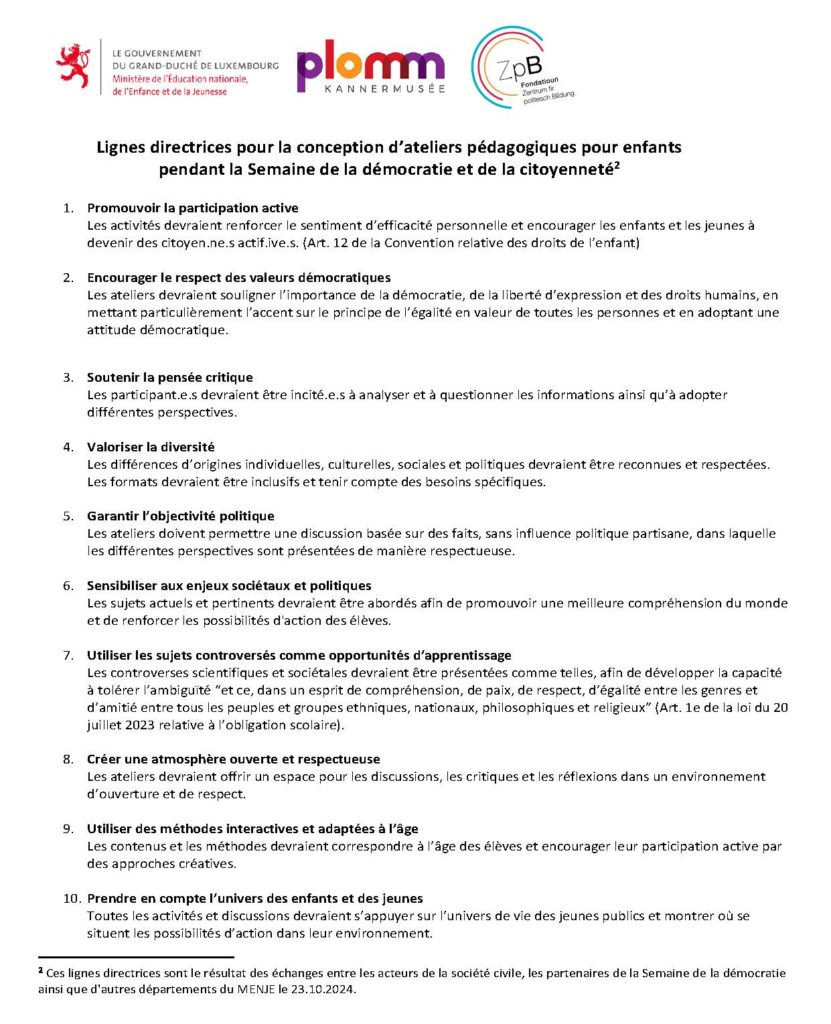 Ce support aide les écoles fondamentales à organiser leur Semaine de la démocratie. Il offre l’occasion de développer des projets créatifs, des discussions et des moments festifs, tout en valorisant les initiatives déjà présentes dans l’école. Le guide rassemble des idées d’activités et des conseils pratiques pour encourager la participation active des élèves, et met en avant un contact principal en cas de questions.