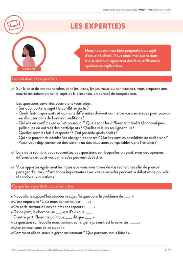 Les participant·e·s se familiarisent avec les processus décisionnels démocratiques et reconnaissent la complexité des contextes politiques. Ils/Elles renforcent également leur capacité à former des jugements, à réfléchir par eux/elles-mêmes et à trouver des consensus.