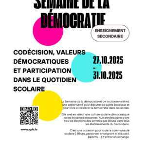 Ce support aide les écoles fondamentales à organiser leur Semaine de la démocratie. Il offre l’occasion de développer des projets créatifs, des discussions et des moments festifs, tout en valorisant les initiatives déjà présentes dans l’école. Le guide rassemble des idées d’activités et des conseils pratiques pour encourager la participation active des élèves, et met en avant un contact principal en cas de questions.