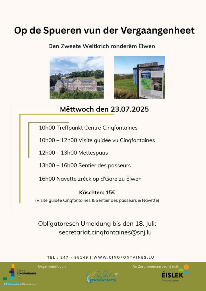 D’Käschte belafe sech op 15 Euro pro Persoun an decken d’Visitten zu Cinqfontaines a vum Sentier des passeurs, sou wéi d’Navette fir op Ëlwen.