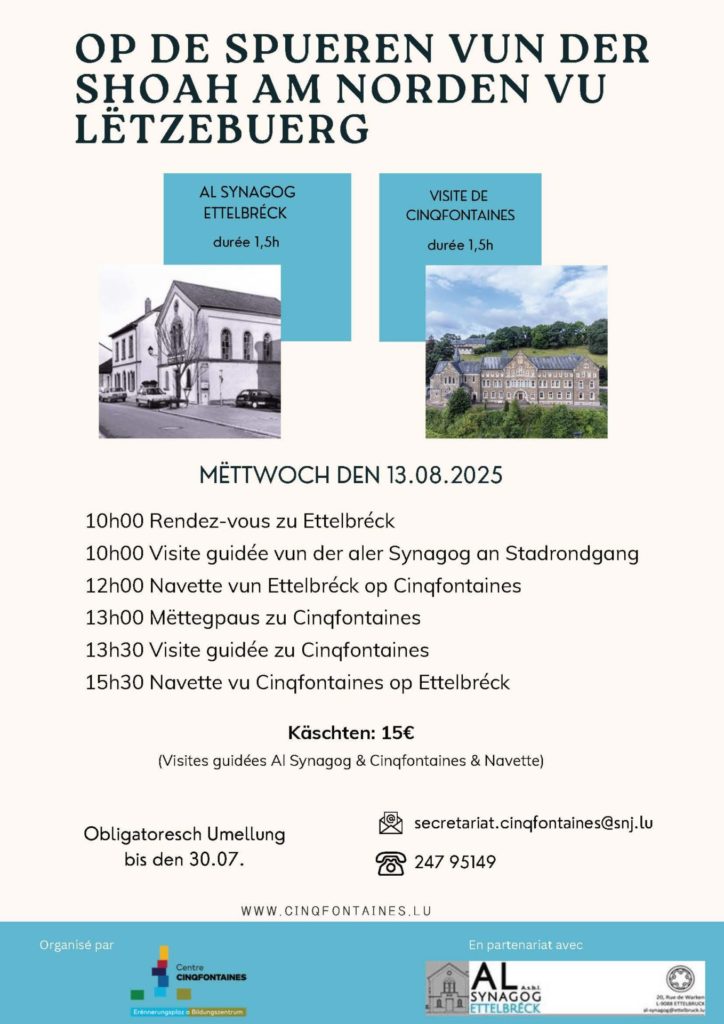 Mëttes geet et da weider op Cinqfontaines. An dësem eemolege Klouschter vun der Herz-Jesu Gemeinschaft hunn d’Nationalsozialisten tëschent 1941 an 1943 dat sougenannten “jüdisches Altersheim Fünfbrunnen” ageriicht. Eng 300 Judden a Jüddinnen, déi deen Ament zu Lëtzebuerg gelieft hunn, goufe wärend där Zäit do internéiert, éier déi meescht vun hinnen a Konzentratiounslager deportéiert goufen.
